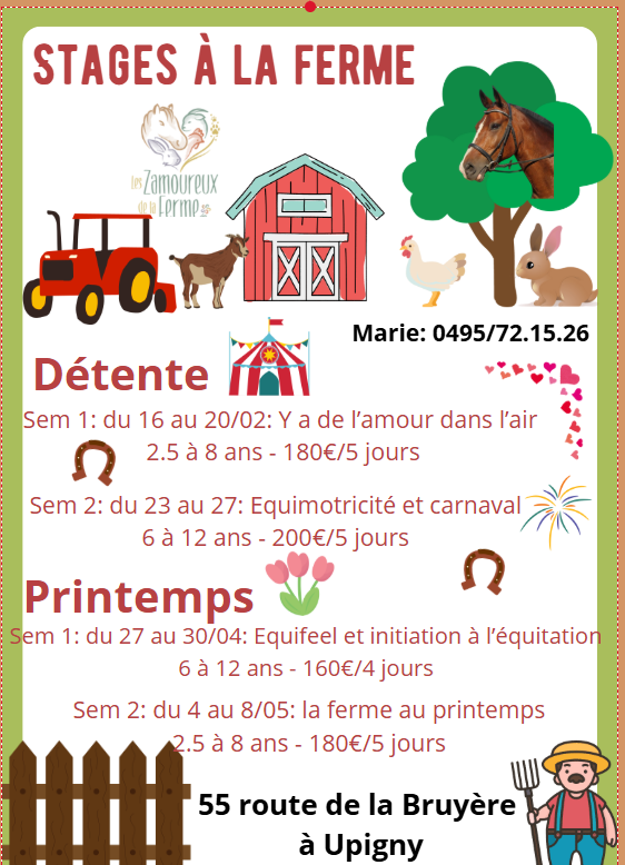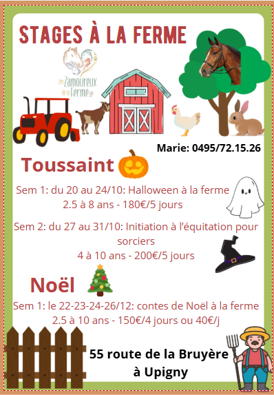 - Renseignements pratiques: Prévoir la collation du matin et de l’après-midi et le pique-nique du midi ainsi que les boissons. Prévoir des vêtements adaptés aussi bien à la météo qu’à l’endroit (n’oubliez pas qu’ils vont jouer toute la journée dans une ferme et à l’extérieur), Prévoyez des vêtements de rechanges + chaussettes. Prévoyez aussi des bottes ou chaussures de marche et un casque vélo ou bombe d’équitation.